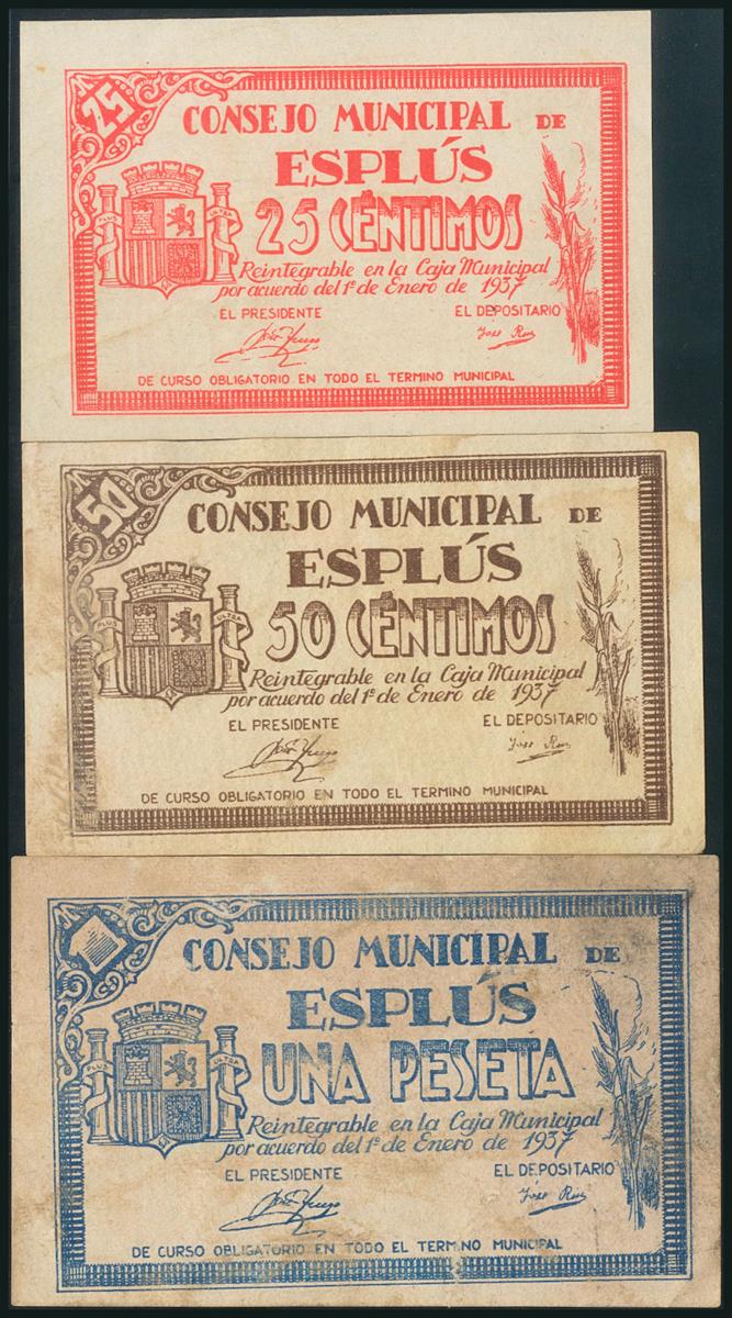 English ESPLUS (HUESCA). 25 Cents, 50 Cents and 1 Peseta. January 1, 1938. (González: 2345, 2346, 2347). Unusual VF/ VG.