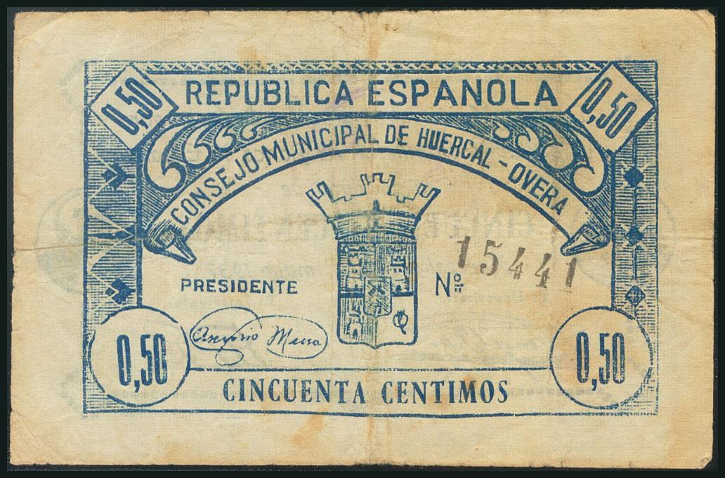 HUERCAL-OVERA (ALMERIA). 50 cents. May 1, 1937. (González: 2890). Rare. F.