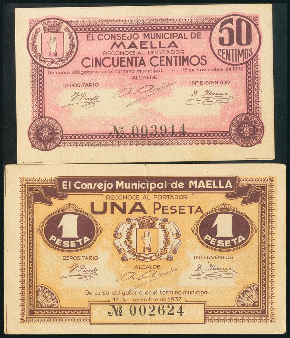English MAELLA (ZARAGOZA). 50 Cents and 1 Peseta. November 1, 1937. (González: 3312/13). Unusual complete series. AU/ XF.