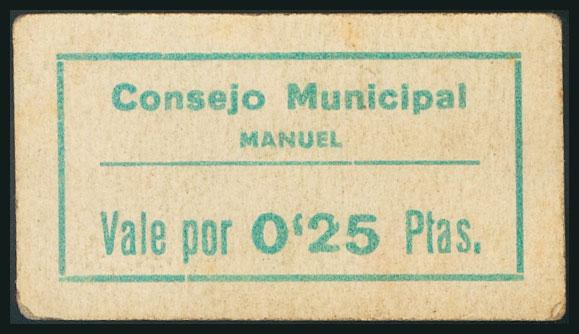 English MANUEL (VALENCIA). 25 cents. (1938ca). (González: 3366). Very rare. AU.