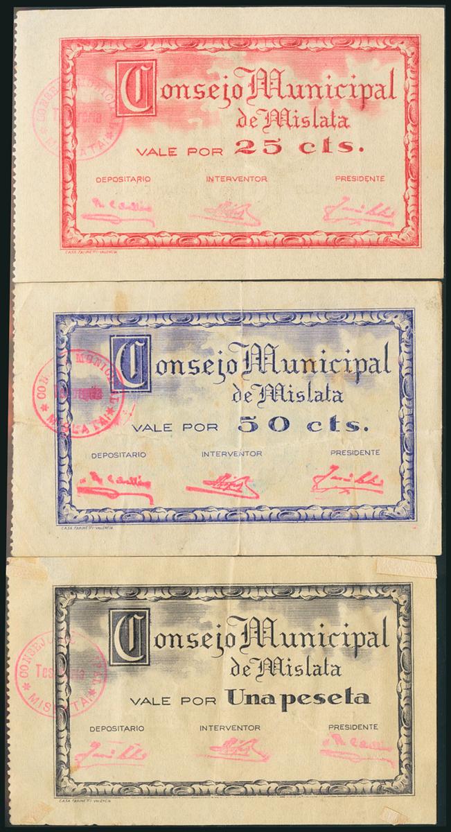 English MISLATA (VALENCIA). 25 Cents, 50 Cents and 1 Peseta. December 1, 1937. (González: 3566/68). Very rare complete series. AU/ F.