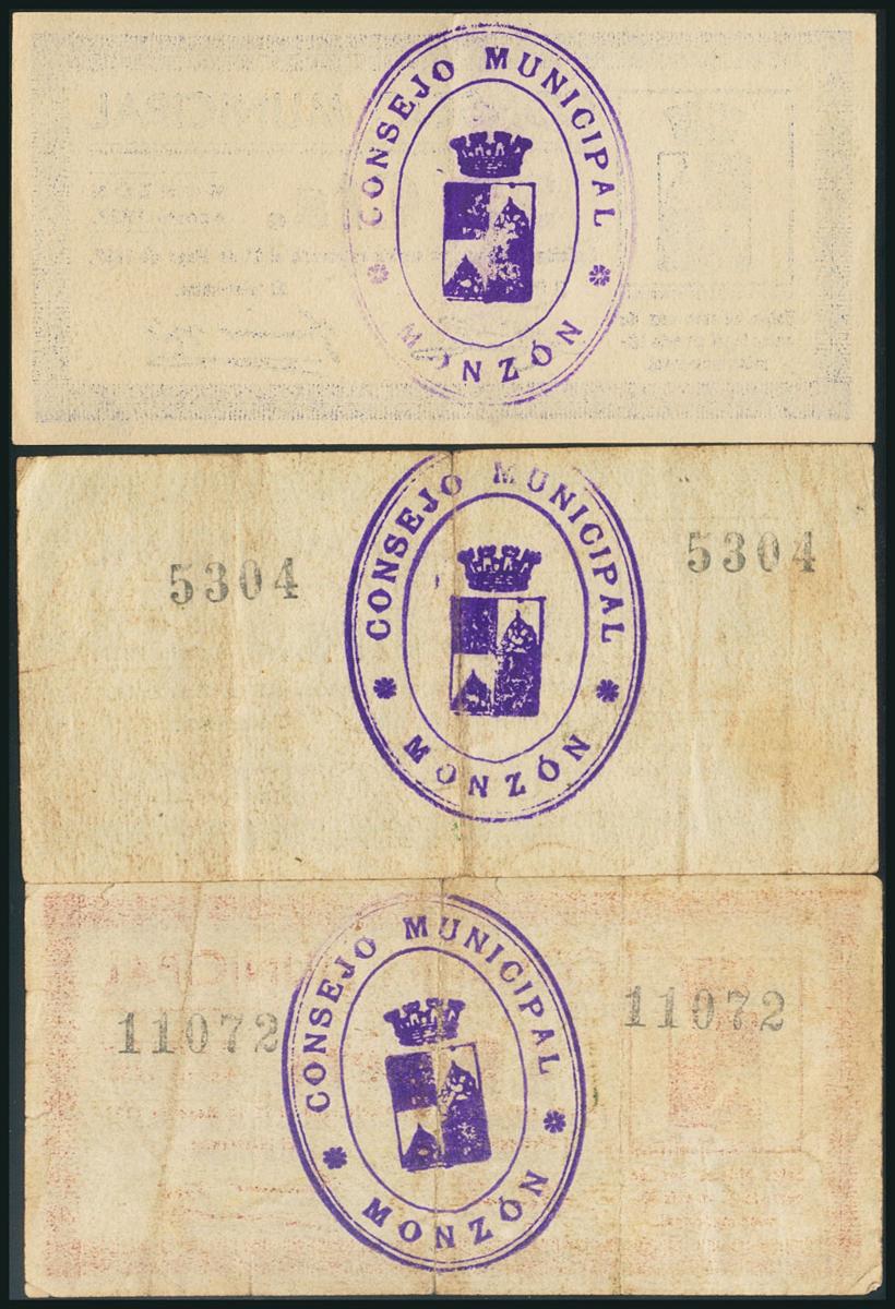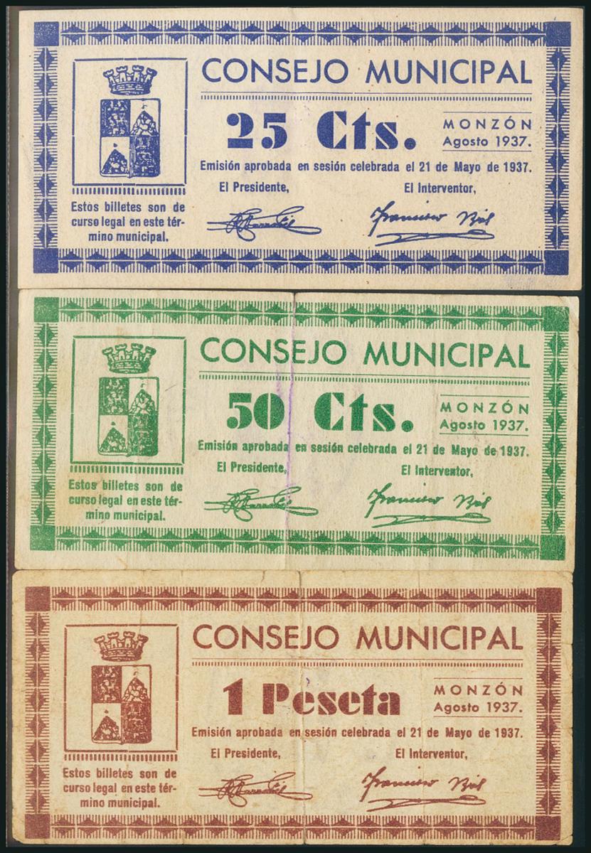 MONZON (HUESCA). 25 Cents, 50 Cents and 1 Peseta. (González: 3677/79). Rare complete series. AU/ F.