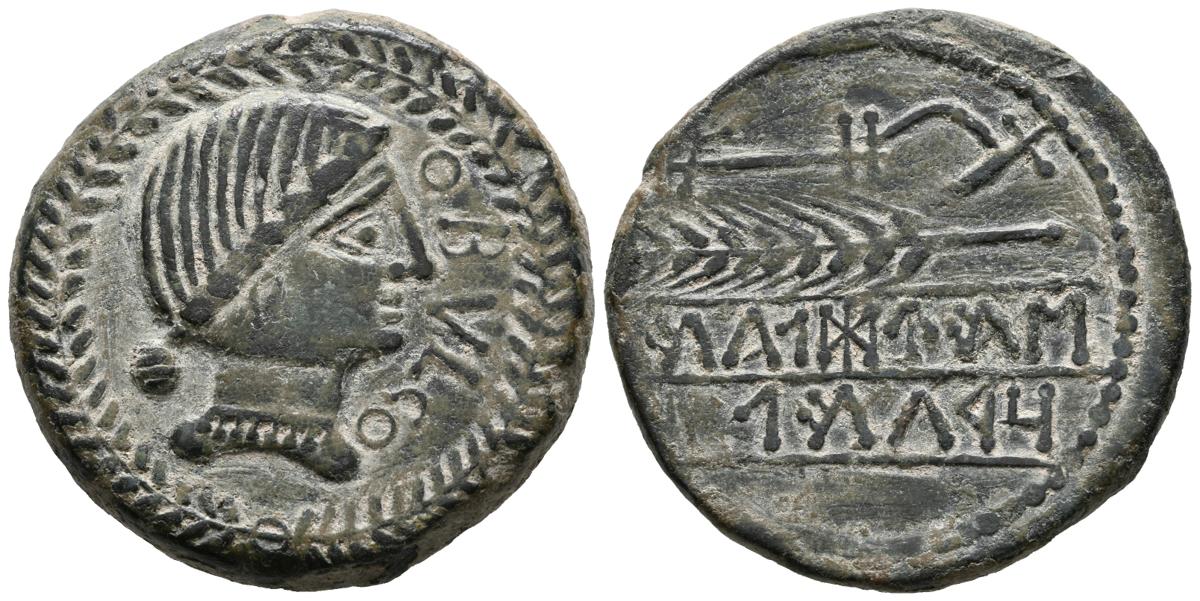 OBULCO (Porcuna, Jaén). Dupondio. (Ae. 25.50g / 34mm). 220-20 BC Anv: Female head to the right inside laurea, crescent in front and legend: OBVLCO. Rev: Plow to the right, under the spike and Iberian leyeda to the left in two lines: SIUBoLAI / ORCaIL. (FAB-1779). VF.