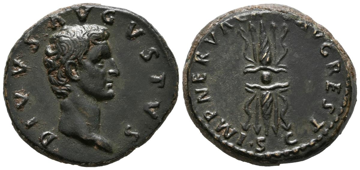 DIVO AUGUST. As. (Ae. 13.07g / 28mm). 98 AD Rome. Anv: DIVVS AVGVSTVS. Naked bust of Divo Augusto. Rev: IMP NERVA CAES AVG REST. Winged lightning. (RIC 130). XF. Retouched. Scarce specimen. In the last year of Nerva's reign, this commemorative or posthumous coin is issued in the name of Augustus. It combines the portraits of both emperors on the front and back. In general, although it is not the case of the coin in question, the portrait of the Divo usually appears with a radiated crown. It should also be noted that pieces of this type were minted in the name of Divas, in the case of these, their faces are usually covered by a veil.