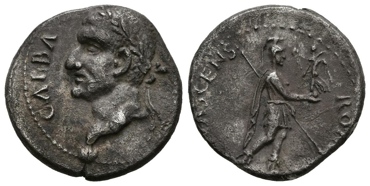 GALBA. Denarius. (Ar. 3.37g / 18mm). 68 AD Tarraco. Anv: GALBA IMP. Galba laureate bust on the left, below globe. Rev: ROMA RENASCENS. Roma in short tunic and helmet on the right, carrying Victoria and spear. (RIC 25). VF. Beautiful and rare specimen.