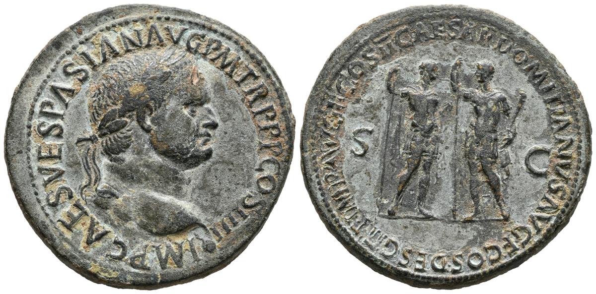 English VESPASIAN. Sesterce. (Ae. 26.14g / 36mm). 72 AD Lugdunum. Anv: IMP CAES VESPASIAN AVG PM TR PPP COS IIII. Vespasian laureate bust to the right. Rev: T IMP AVG F COS II CAESAR DOMITIANVS AVG F COS DESG II. Titus and Domitian front shelves both holding spear and dagger, between UNC. (RIC 1185). VF. Very rare specimen.