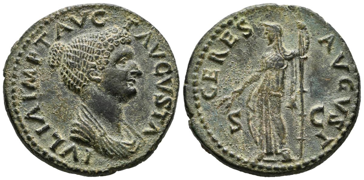 JULIA TITI. Dupondio. (Ae. 12.47g / 28mm). 80-81 AD Rome. Anv: IVLIA IMP T AVG AVGVSTA. Draped bust with bow on the right of Julia Titi. Rev: CERES AVGVSTI. Ceres shelf to left holding spikes and scepter. (RIC 392). XF. Contemporary patina. Very rare specimen. Or also known as Julia Flavia, she was the only daughter of Emperor Tito and his second wife Furnilla. A woman of great beauty ended up being the lover of her uncle Domitian who, once emperor, had her husband, Sabino, assassinated to make a marital life with her. The coins in which Julia Flavia appears maintain realism as their main hallmark but without hiding a certain sweetness on her feminine face.
