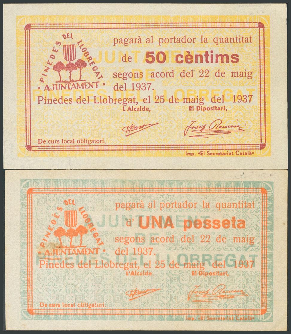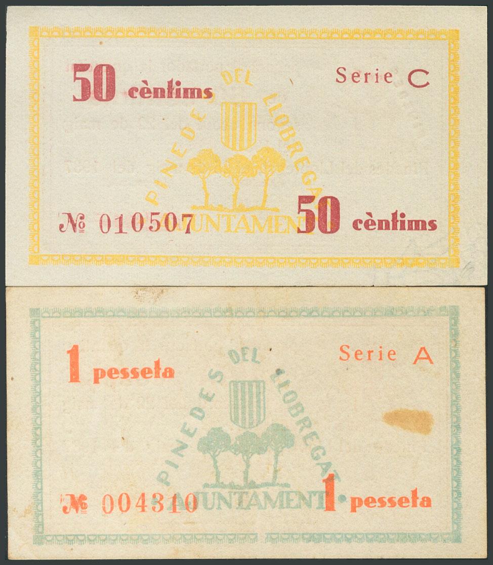 PINEDES DEL LLOBREGAT (BARCELONA). 50 Cents and 1 Peseta. May 1937. Series A and C, respectively. (González: 9229/30). Complete series. UNC/ AU.