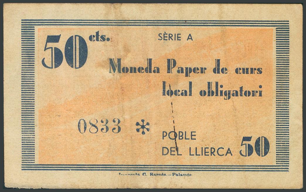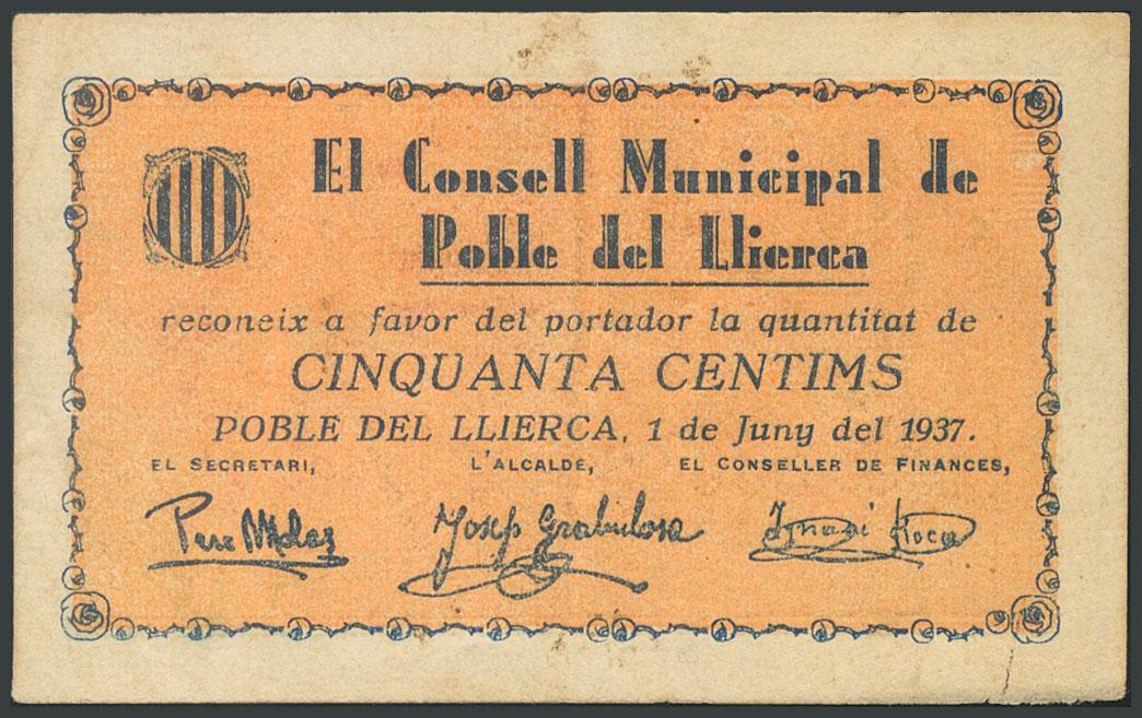 TOWN OF LLIERCA (GERONA). 50 Cents. June 1, 1937. Series A. (González: 9352). Weird. VF.