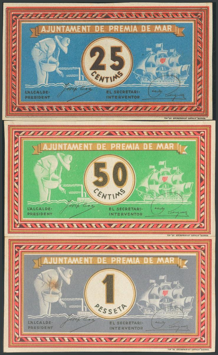 PREMIA DE MAR (BARCELONA). 25 Cents, 50 Cents and 1 Peseta. September 1937. Series D, C and B, respectively and without numbering. (González: 9468, 9469, 9470). UNC/ AU.