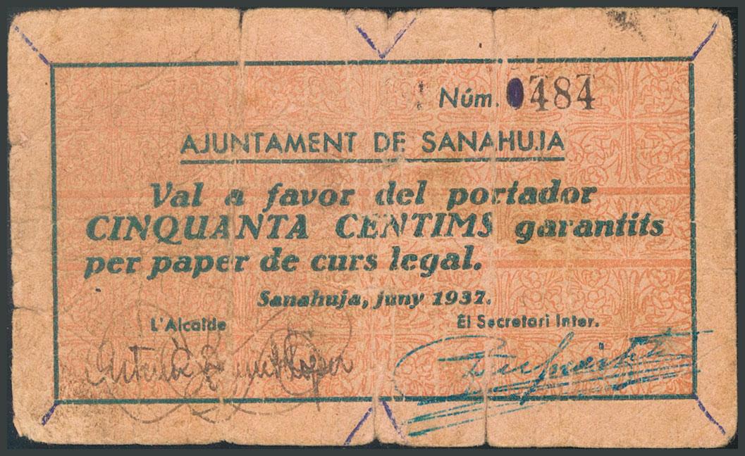 SANAHUJA (LERIDA). 50 Cents. June 1937. No mayoral mark. (González: 9486). Very rare. FR2.