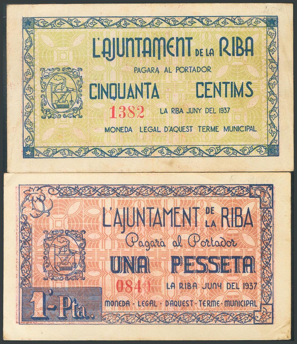 RIBA (TARRAGONA). 50 Cents and 1 Peseta. June 1937. (González: 9601, 9602). Rare VF.