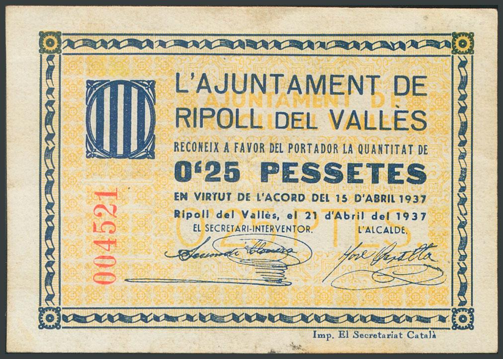 RIPOLL DEL VALLES (BARCELONA). 25 cents. April 21, 1937. Imprint without "<< >>". (González: 9662). Unusual AU.
