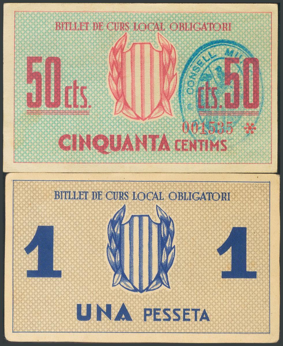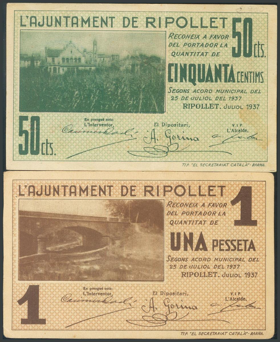 RIPOLLET (BARCELONA). 50 Cents and 1 Peseta. July 25, 1937. (González: 9667/68). Unusual complete series. AU.
