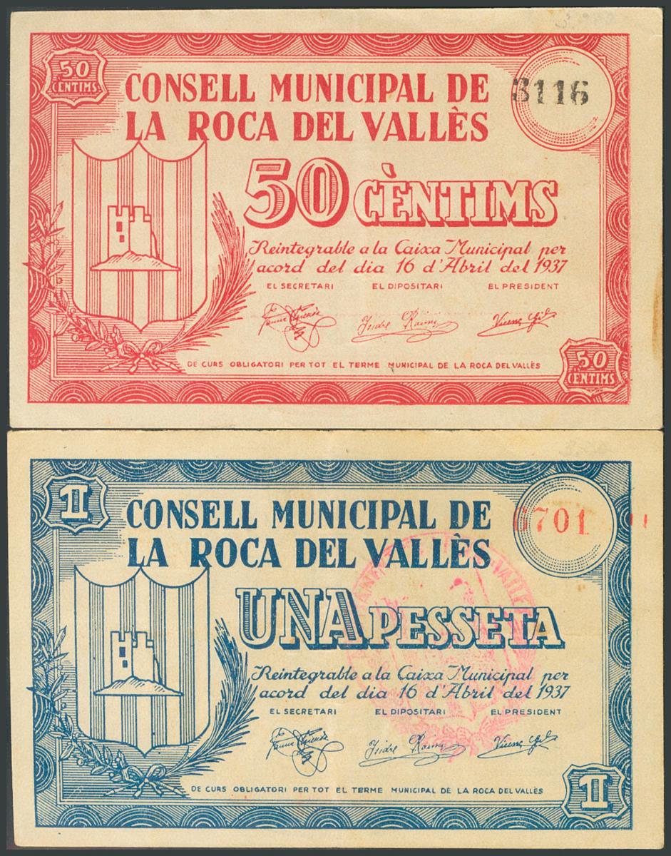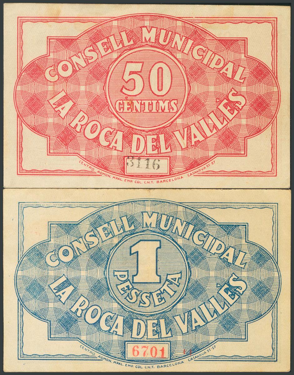 English ROCA DEL VALLES (BARCELONA). 50 Cents and 1 Peseta. April 16, 1937. (González: 9701/02). Unusual complete series. VF.