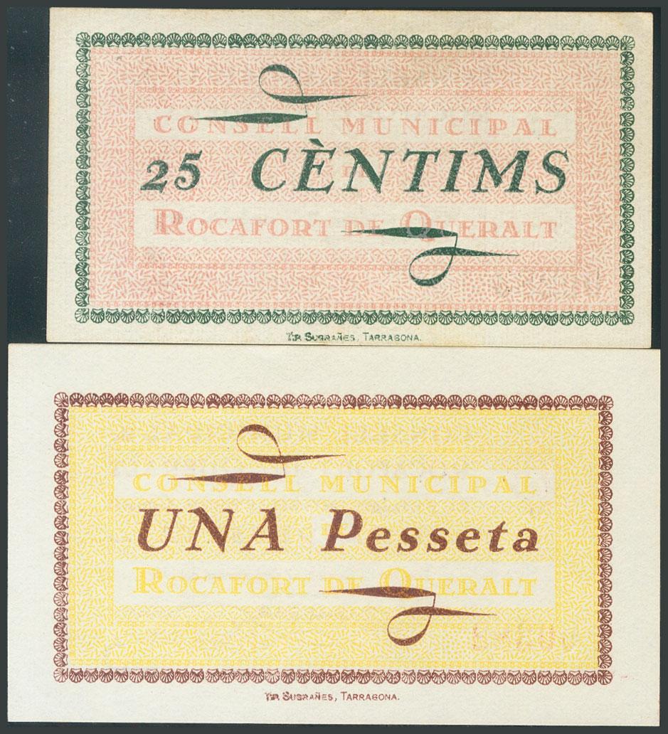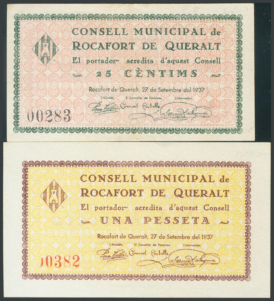 ROCAFORT DE QUERALT (TARRAGONA). 25 Cents and 1 Peseta. September 27, 1937. (González: 9705/06). Unusual complete series. UNC.