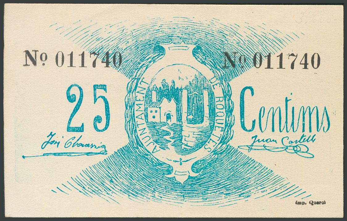 ROQUETES (TARRAGONA). 25 cents. (1937ca). (González: 9735). Unusual UNC.