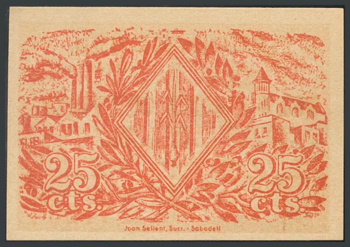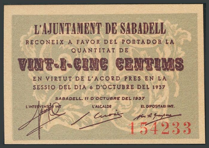 SABADELL (BARCELONA). 25 cents. October 11, 1937. (González: 9778). UNC.