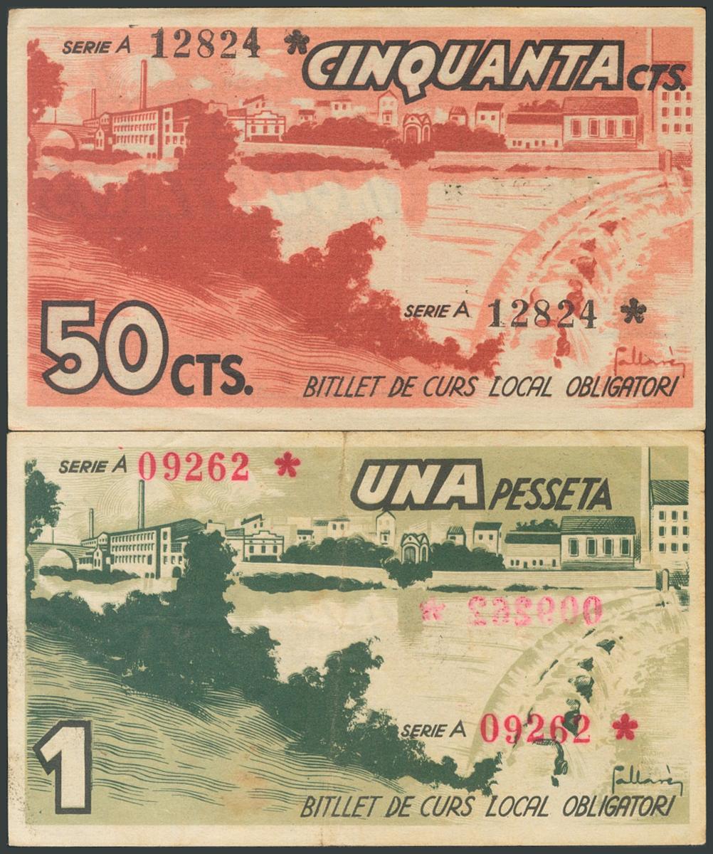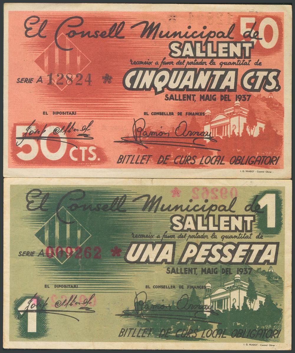 SALLENT (BARCELONA). 50 Cents and 1 Peseta. May 1937. Series A, both. (González: 9822, 9823). AU/ VF.