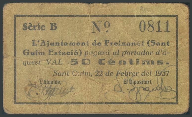SANT GUIM ESTACIO-FREIXENET (LERIDA). 50 Cents. February 22, 1937. Series B. (González: 9852). G.
