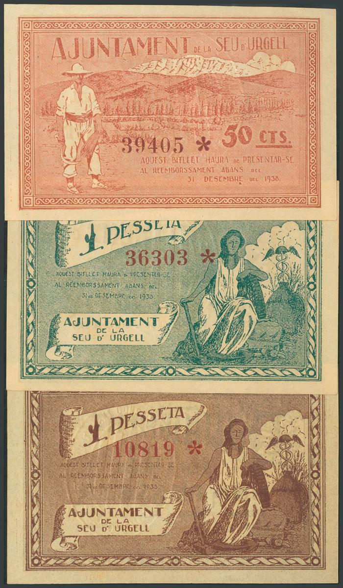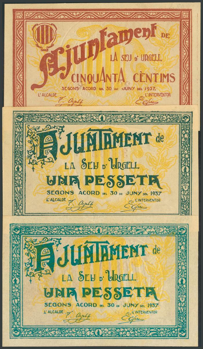 SEU DE URGELL (LERIDA). 50 Cents and 1 Peseta (2). June 30, 1937. (González: 9997, 9998, 9999). UNC/ AU.