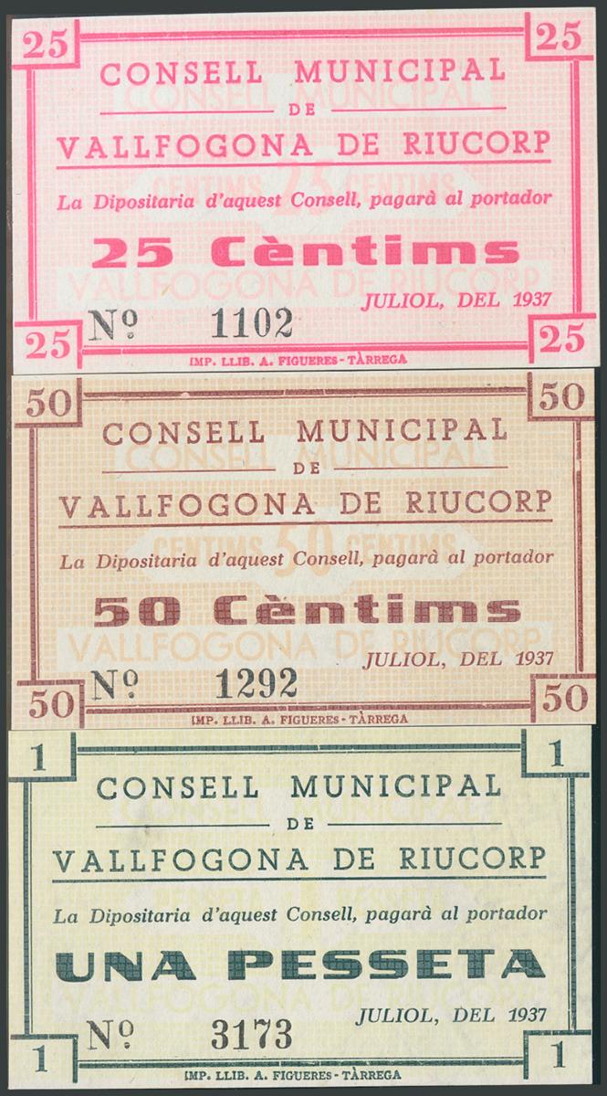 English VALLFOGONA DE RIUCORB (TARRAGONA). 25 Cents, 50 Cents and 1 Peseta. July 1937. (González: 10516, 10517, 10518). Unusual UNC.
