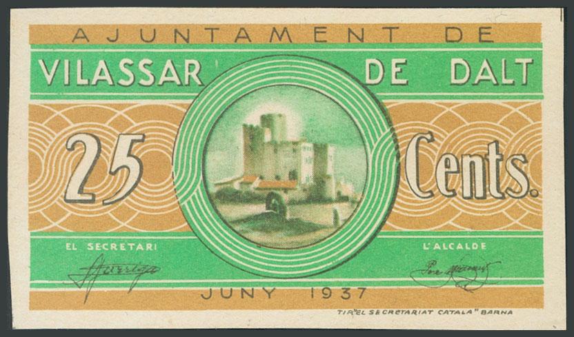 VILASSAR DE DALT (BARCELONA). 25 cents. June 1937. Unnumbered. (González: 10854). UNC.