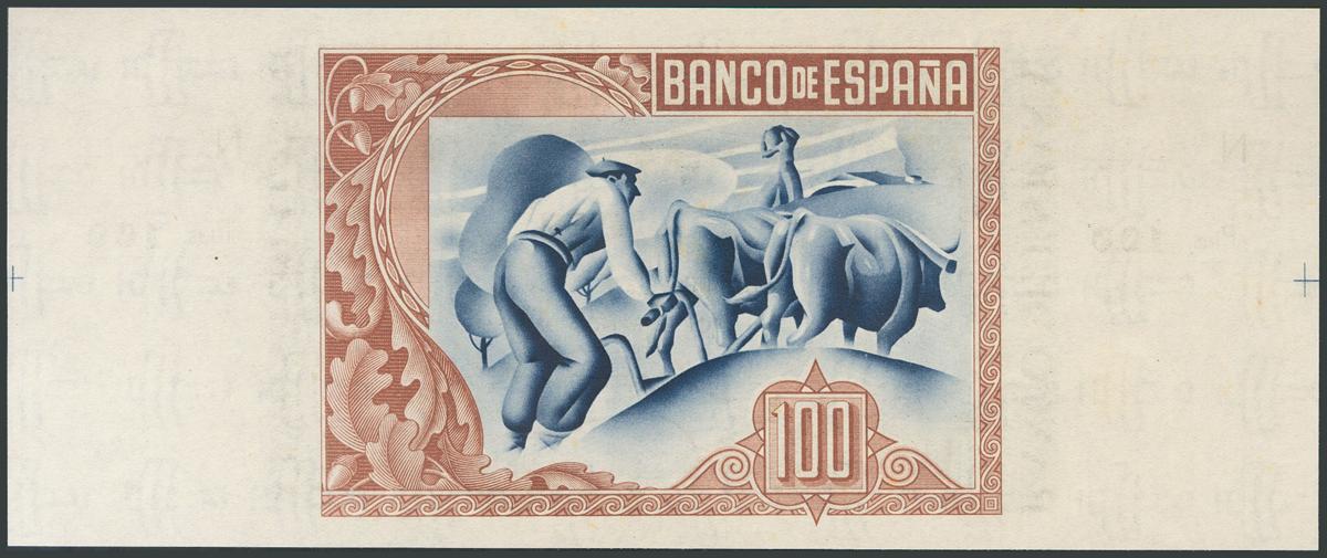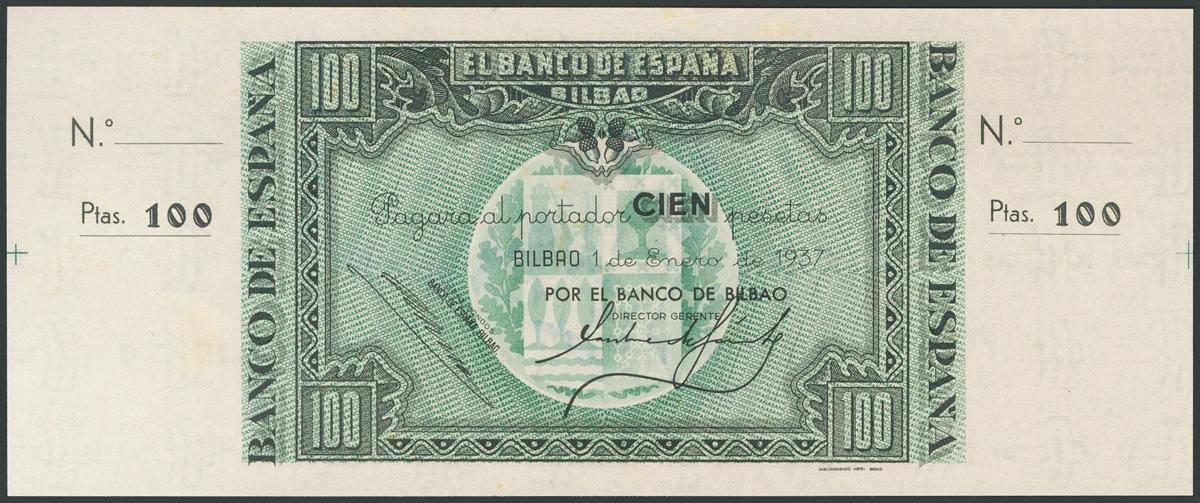 100 Pesetas. January 1, 1937. Bilbao branch, signed by Banco de Bilbao. Without series and without numbering, with both matrices. (Edifil 2017: 390a). UNC.