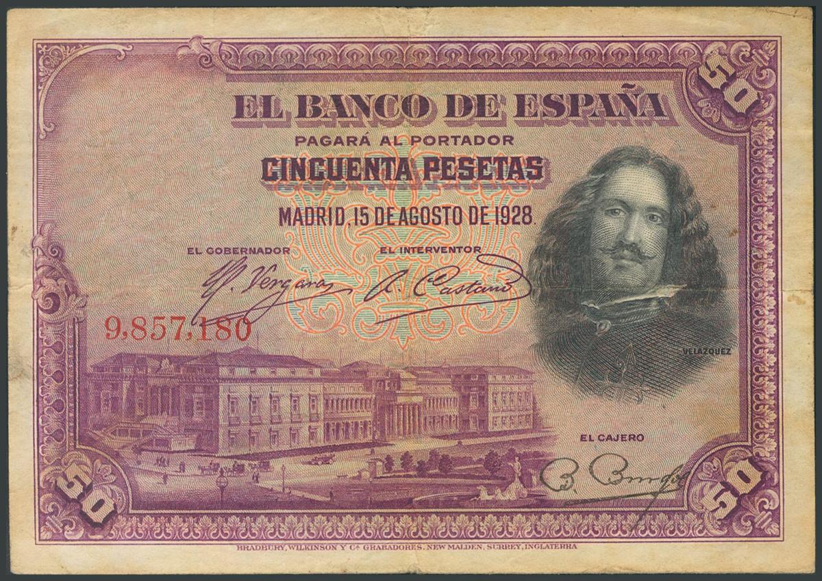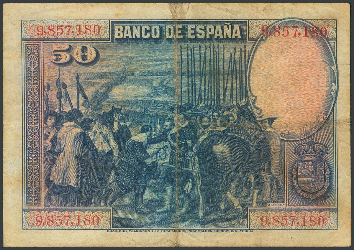 English 50 Pesetas. August 15, 1928. Without series and with stamp stamped Spanish State / Burgos. (Edifil 2017: 407). BC +.