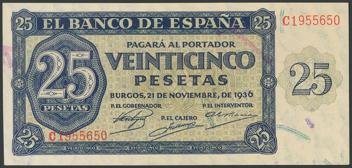 25 Pesetas. November 21, 1936. Series C. (Edifil 2017: 419a). Original sizing. UNC.
