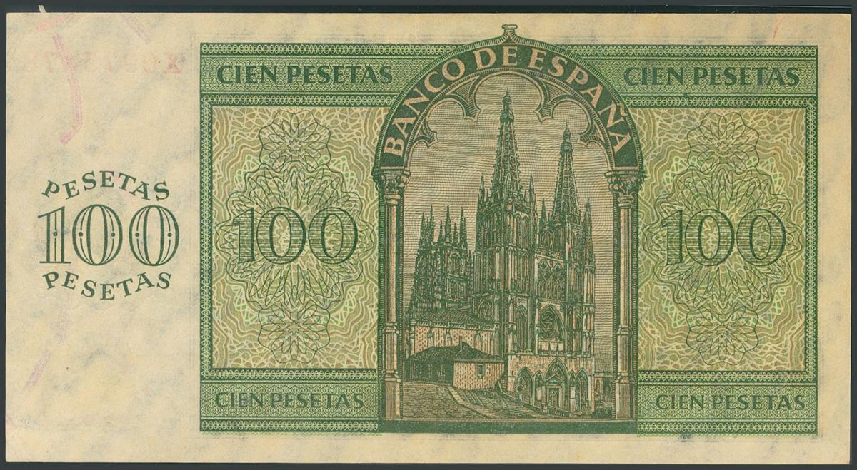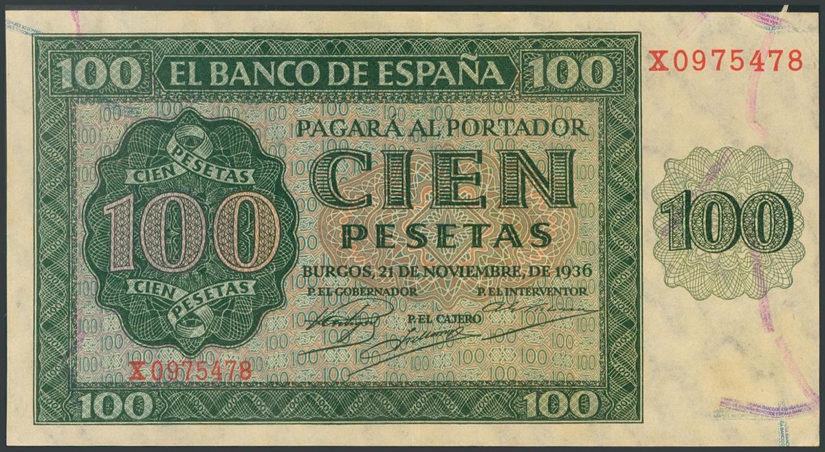 100 Pesetas. November 21, 1936. Series X, last series issued. (Edifil 2017: 421a). It preserves a large part of the original size. AU.