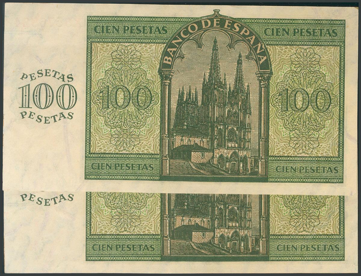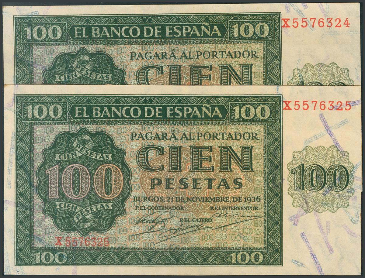100 Pesetas. November 21, 1936. Correlative pair. Series X, last series issued. (Edifil 2017: 421a). Original sizing. UNC.