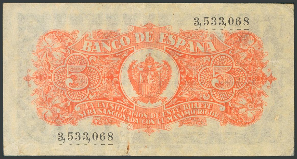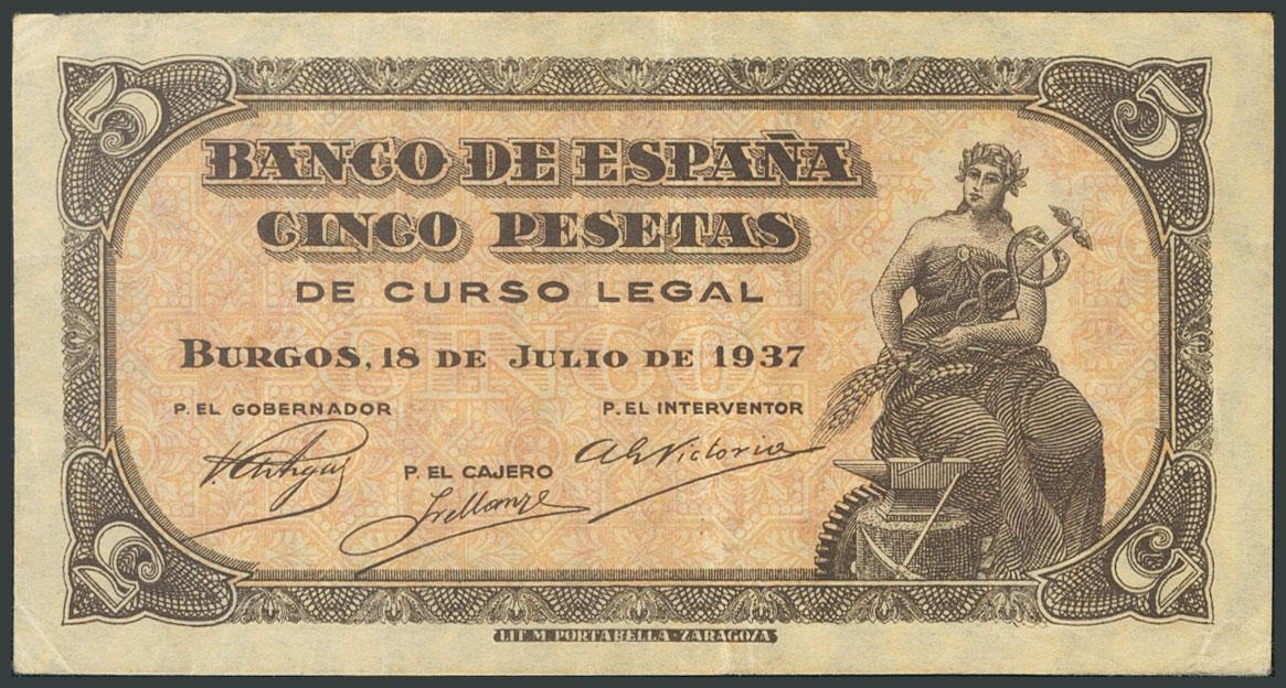 5 Pesetas. July 18, 1937. Without series. (Edifil 2017: 424). F.