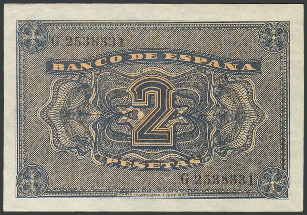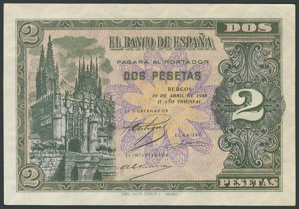2 Pesetas. April 30, 1938. Series G. (Edifil 2017: 429a). Original sizing, marked upper right corner. AU.