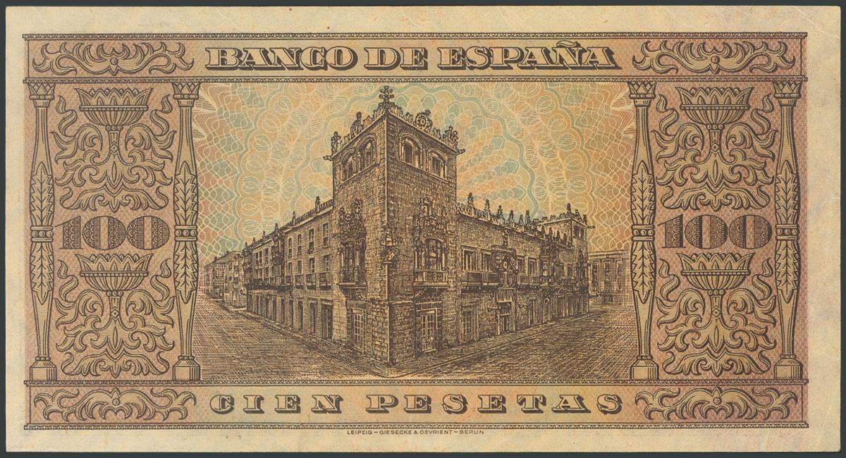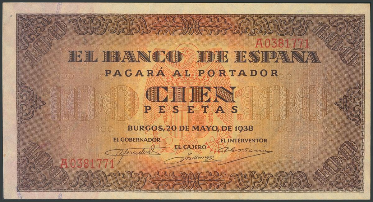 100 Pesetas. May 20, 1938. Series A. (Edifil 2017: 432). Original sizing. AU.