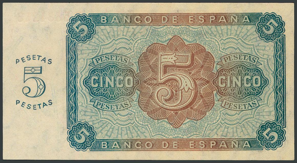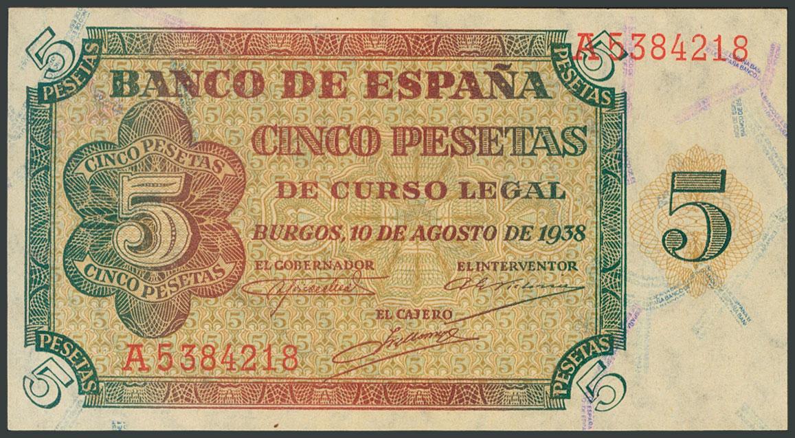 5 Pesetas. August 10, 1938. Series A. (Edifil 2017: 435a). Original sizing. UNC.