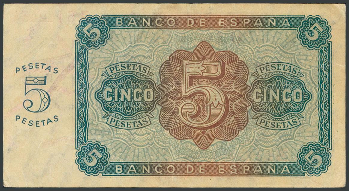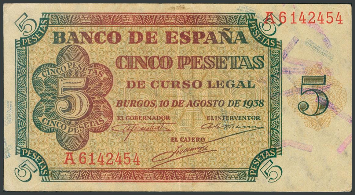 5 Pesetas. August 10, 1938. Series A. (Edifil 2017: 435). Keep some original sizing. AU.