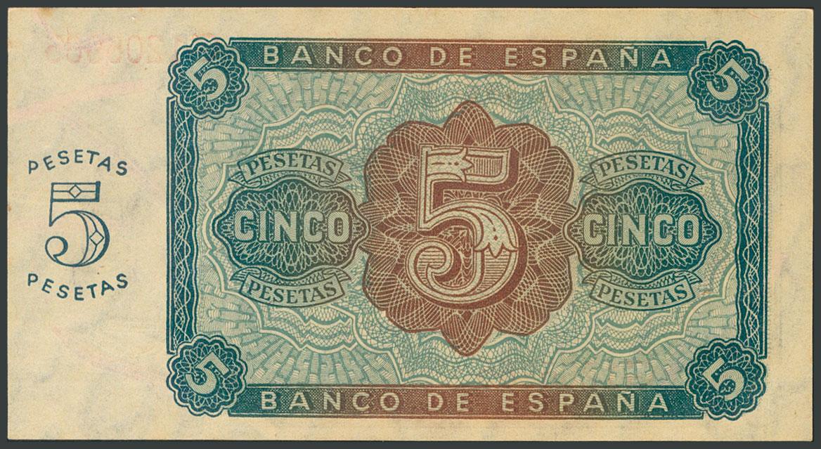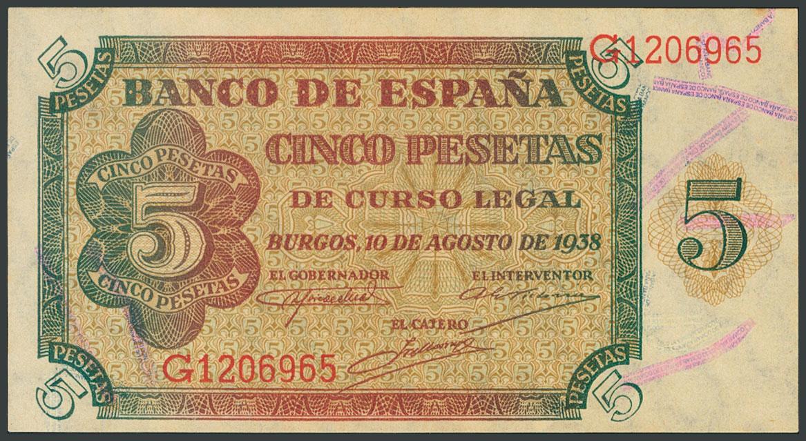 5 Pesetas. August 10, 1938. Series G. (Edifil 2017: 435a). Original sizing, imperceptible shadow on the upper margin. UNC.