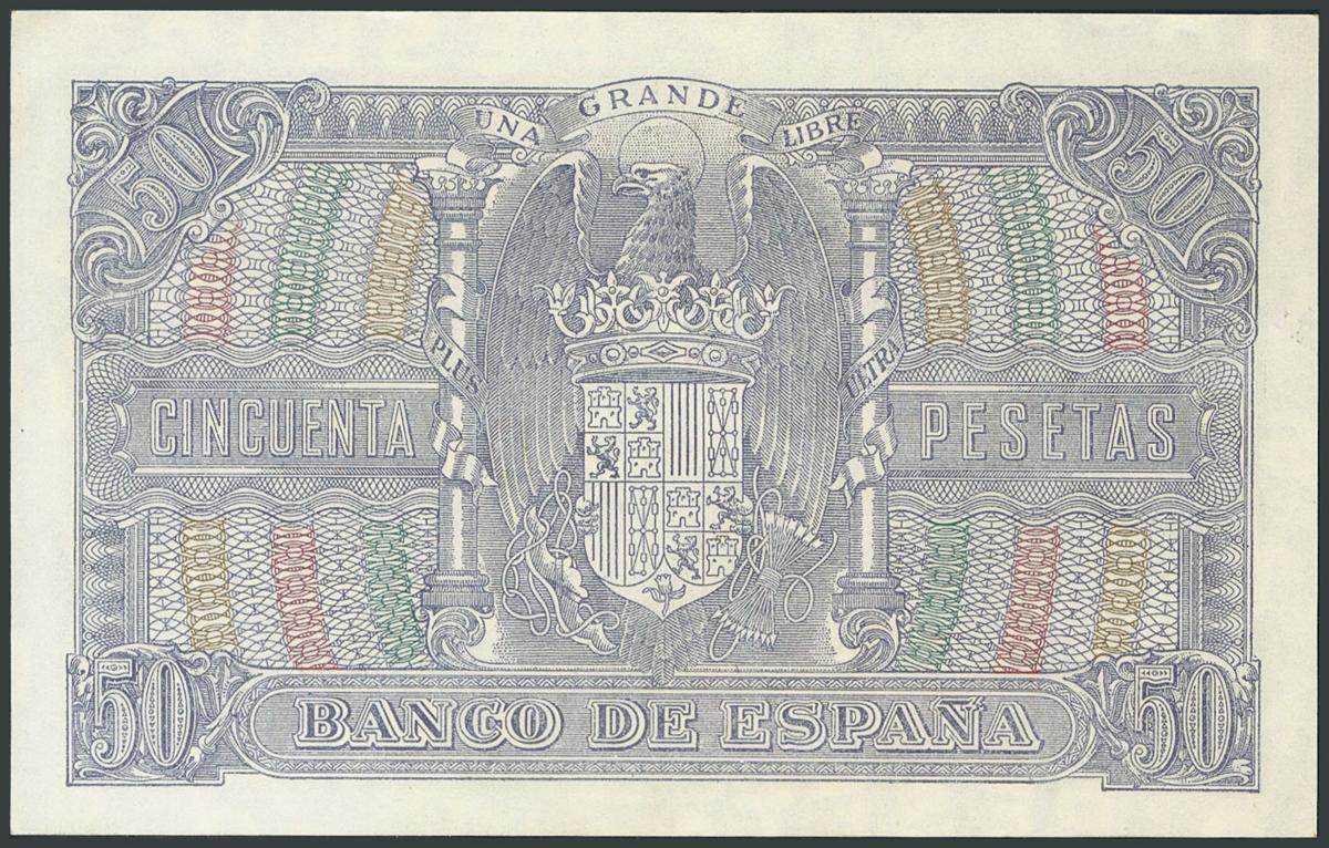 50 Pesetas. January 9, 1940. Series D. (Edifil 2017: 437a). Original sizing. AU.
