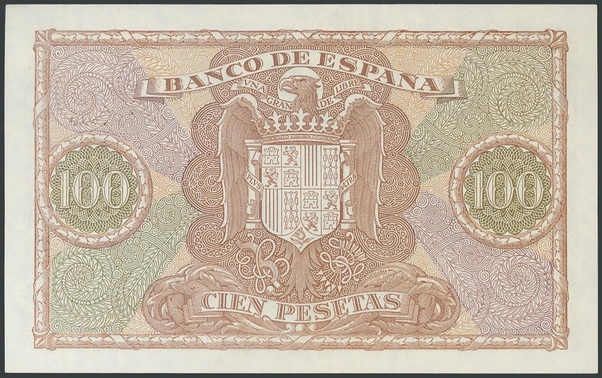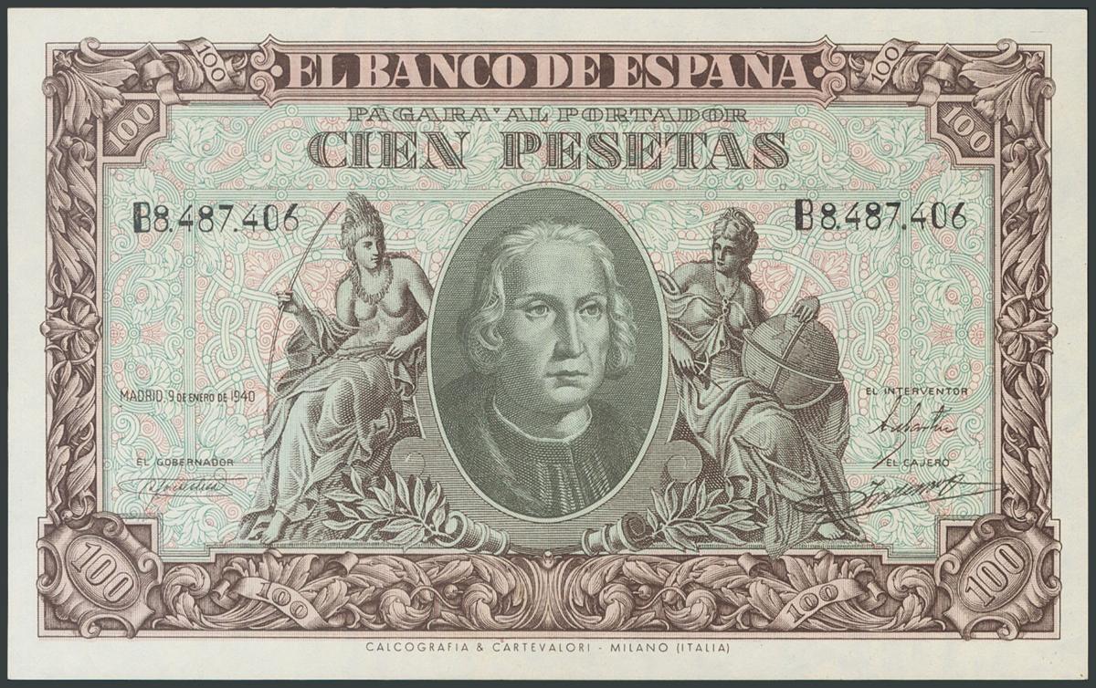 100 Pesetas. January 9, 1940. Series B. (Edifil 2017: 438a). Unusual in this condition, original sizing. UNC.