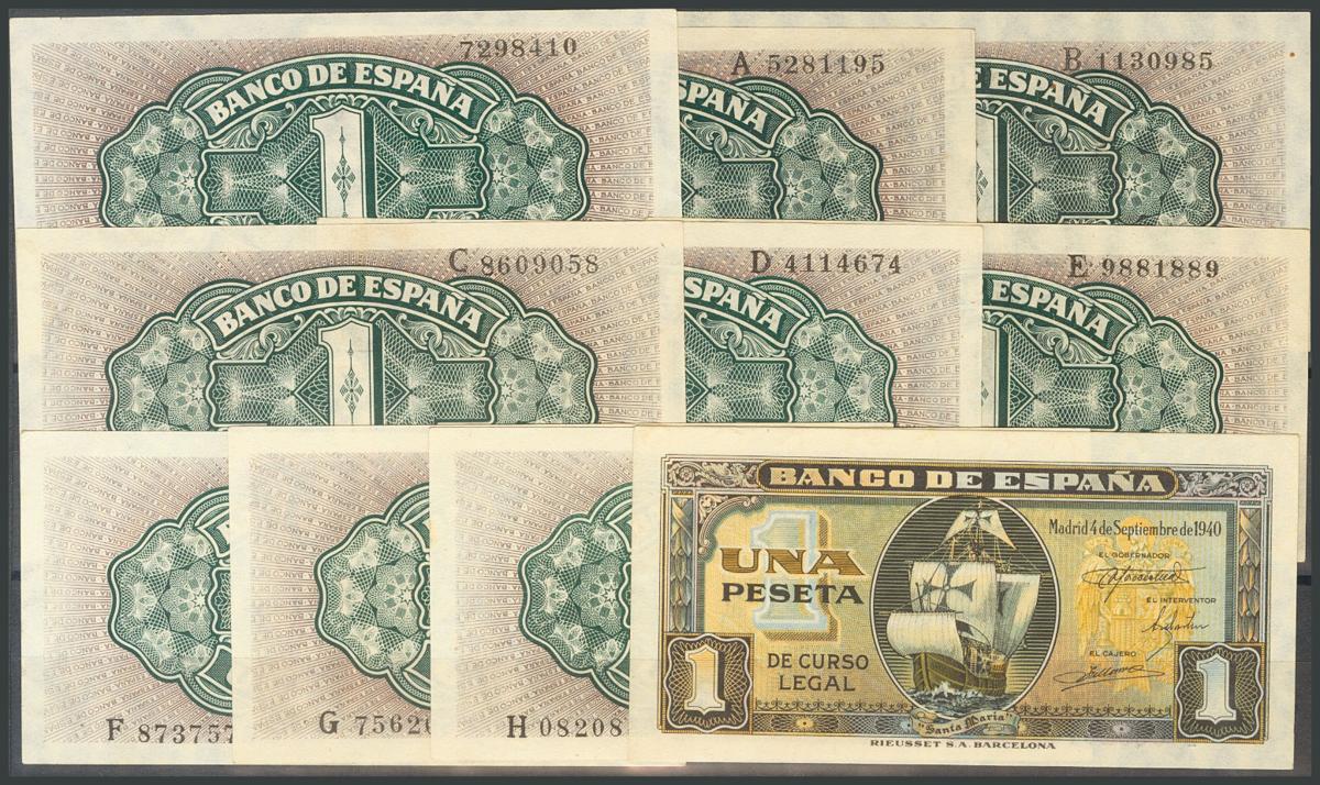English Beautiful and very interesting set of 10 1 Peseta notes issued on September 4, 1940 and including all known series (In total 8: A, B, C, D, E, F, G, H and I and the one without series ). (Edifil 2017: 442, 442a). Rare set and of good quality, all the banknotes present all their original size (the set must be considered for all purposes of the highest quality especially in such a set, it is possible that there is one at most two banknotes in UNC quality and neither even that but we prefer to opt for prudence, in our opinion it is something absolutely despicable). UNC/ UNC.