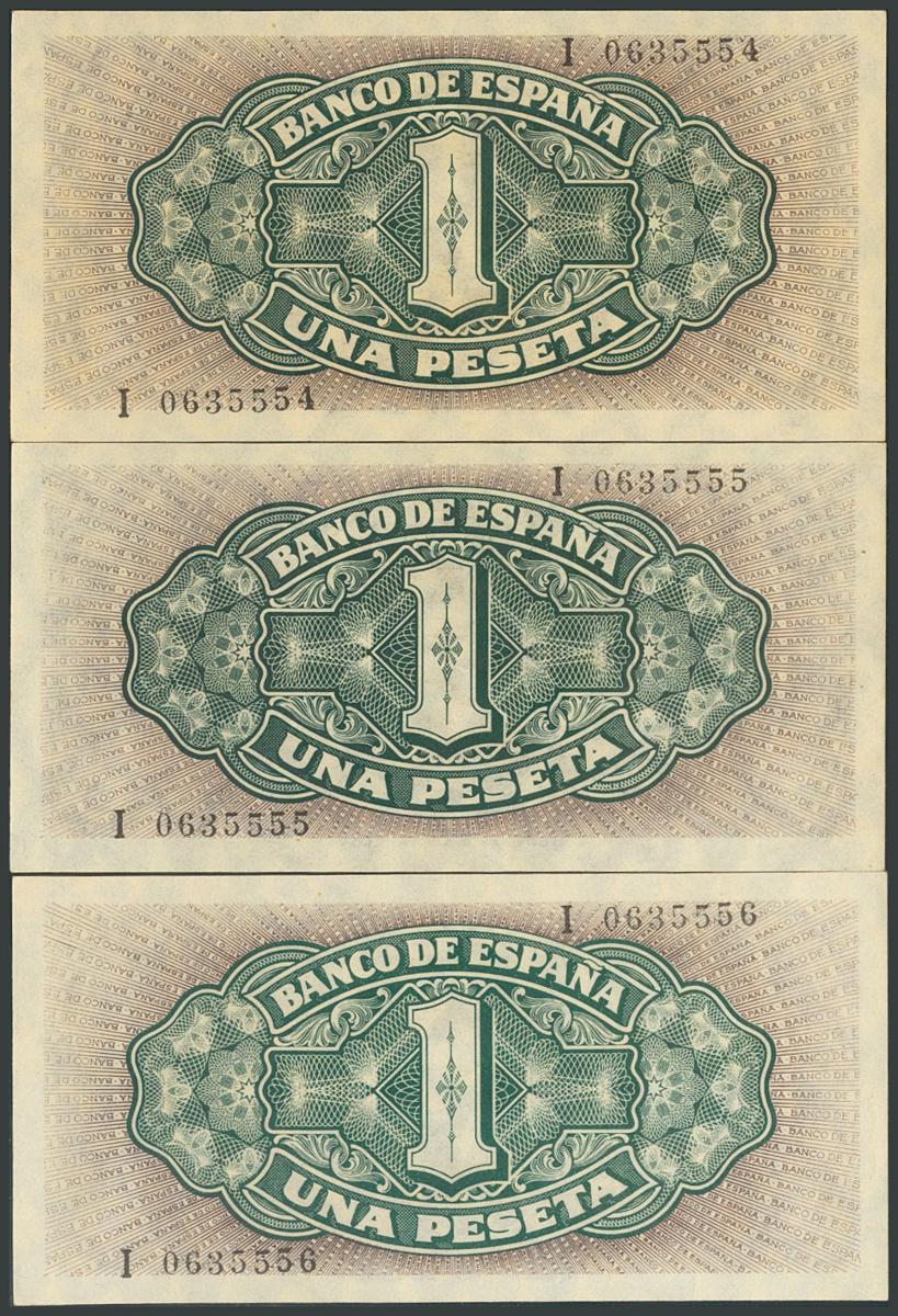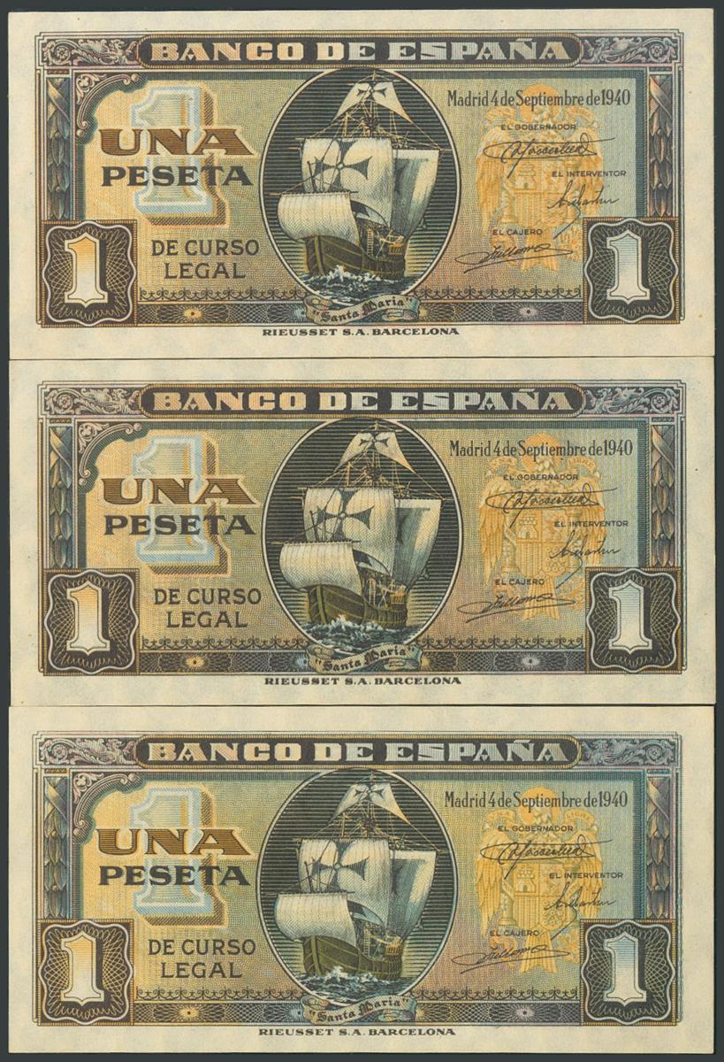 1 peseta. September 4, 1940. Correlative trio. Series I, last series issued. (Edifil 2017: 442a). Unusual and original sizing. UNC.