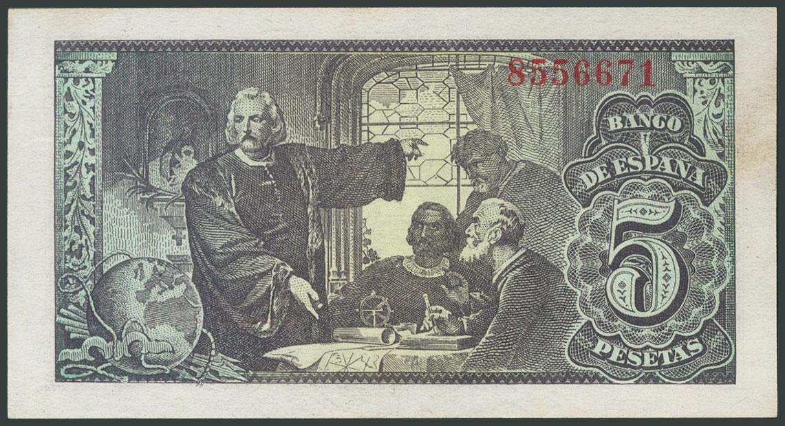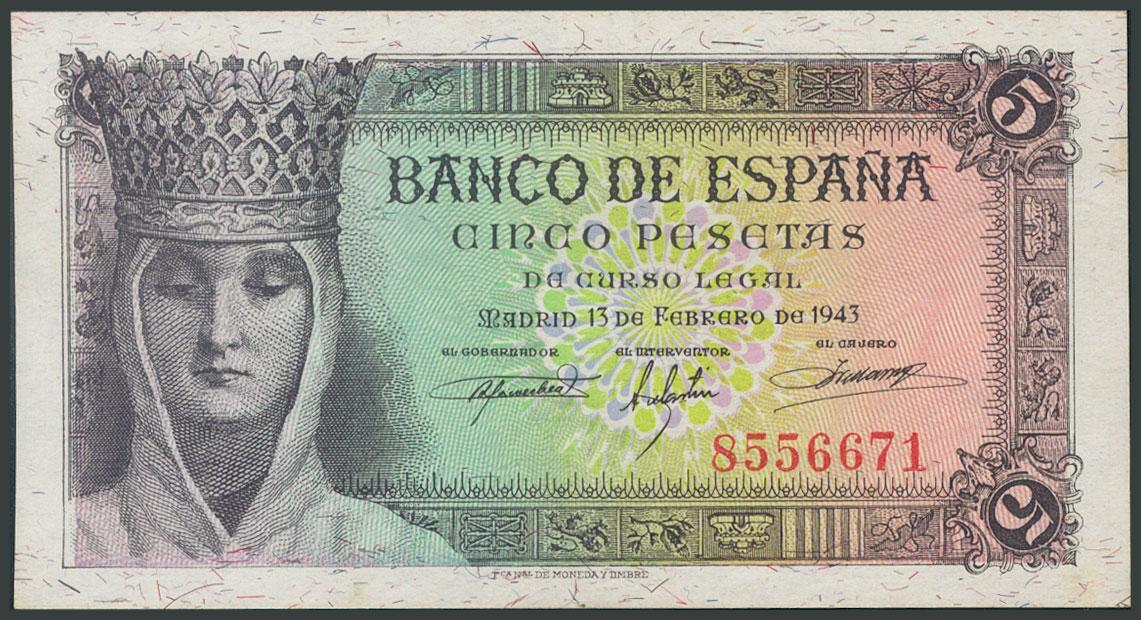 5 Pesetas. February 13, 1943. Without series. (Edifil 2017: 446). UNC.