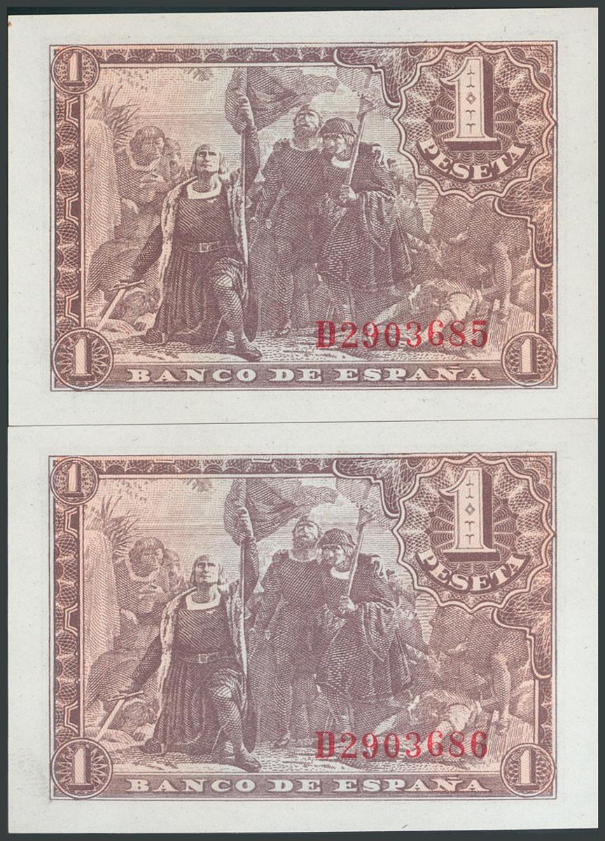 1 peseta. May 21, 1943. Correlative pair. Series D. (Edifil 2017: 447a). UNC.