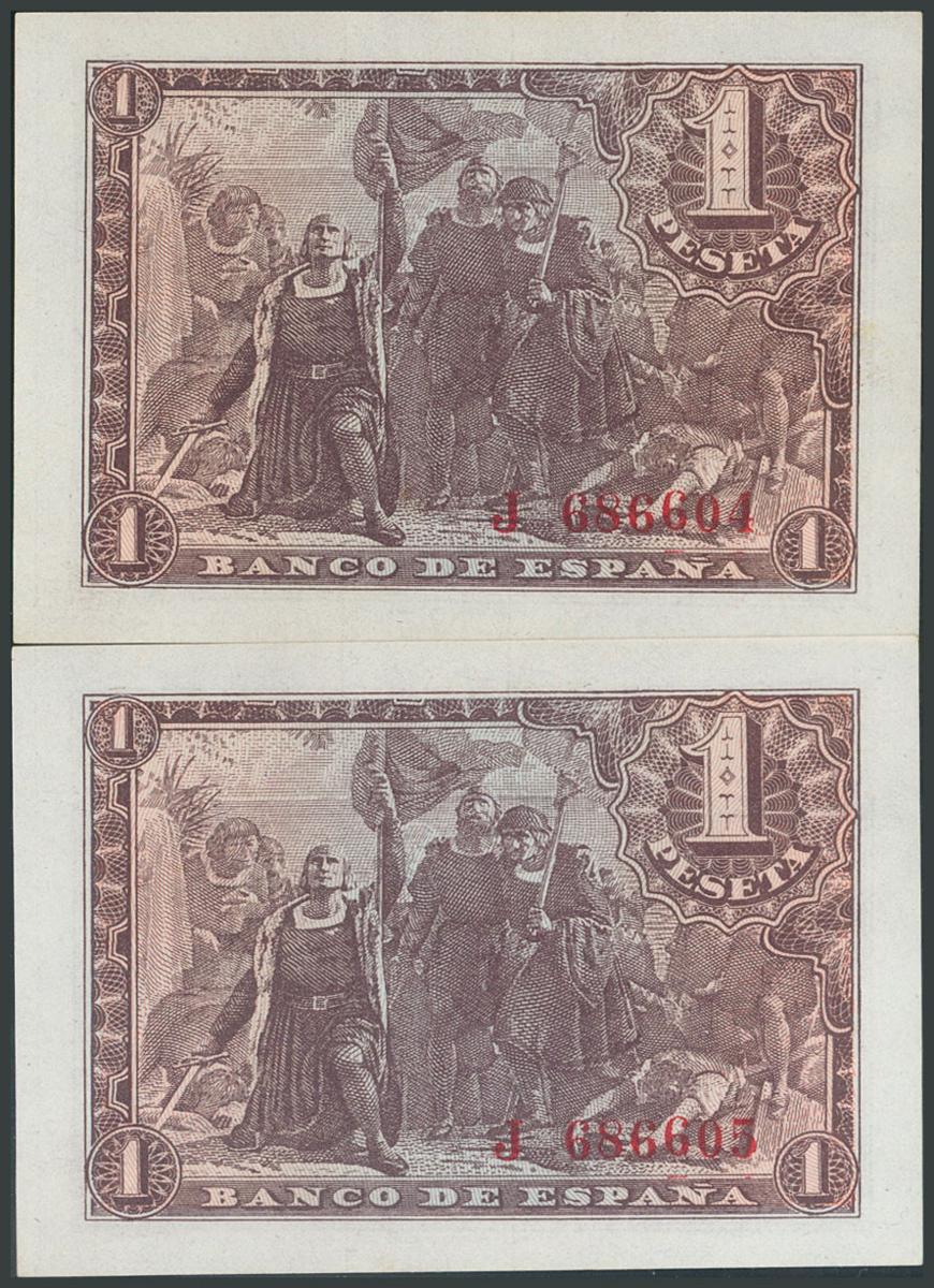 1 peseta. May 21, 1943. Correlative pair. Series J. (Edifil 2017: 447a). UNC.