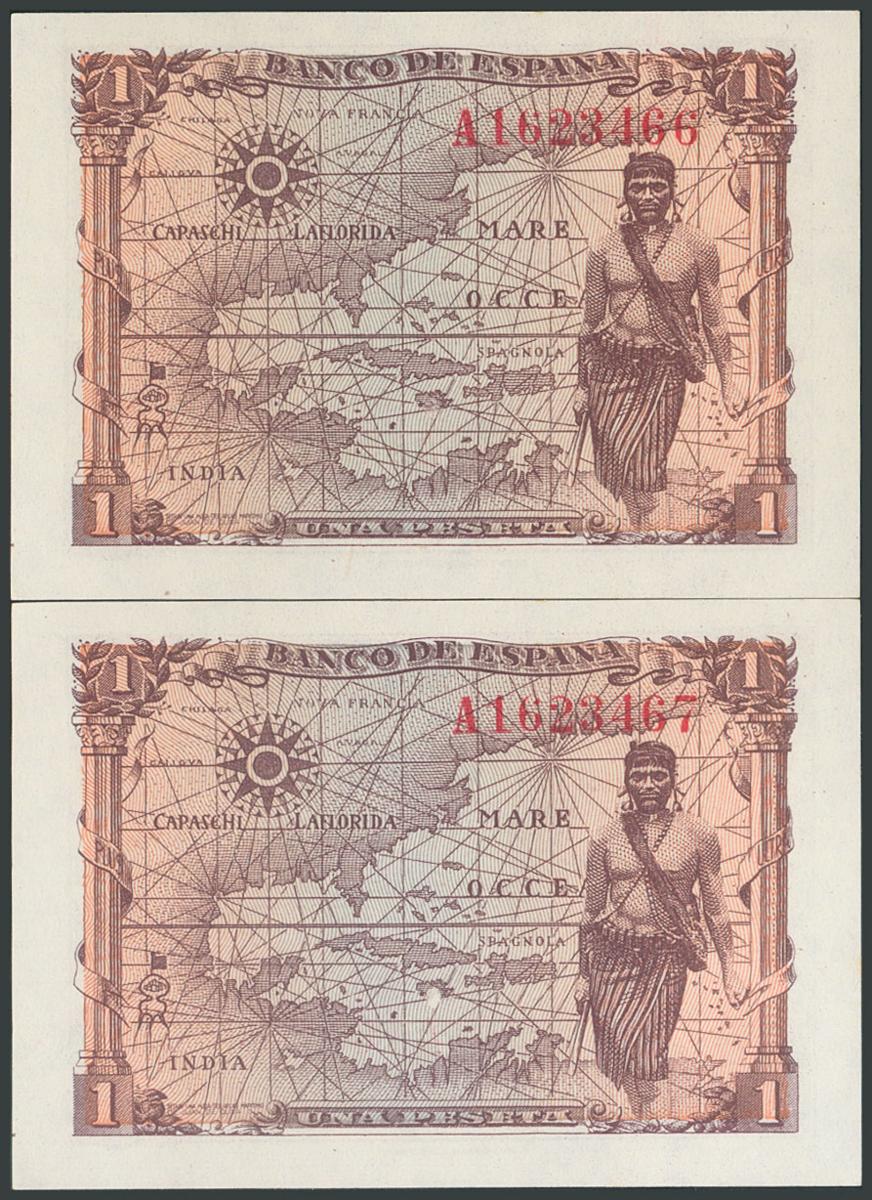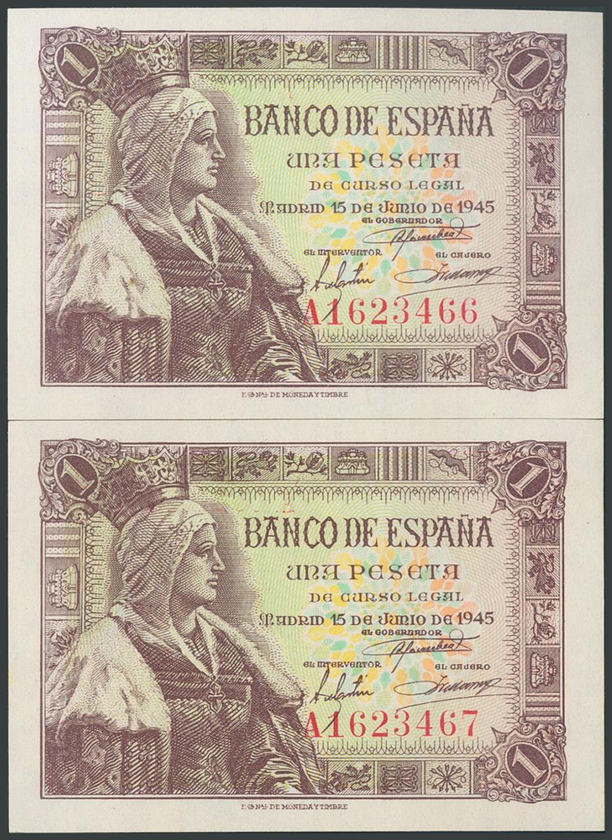 1 peseta. June 15, 1945. Correlative pair. Series A. (Edifil 2017: 448a). Original sizing. UNC.