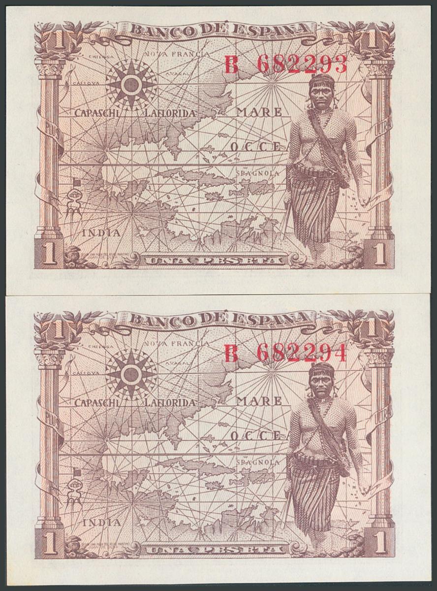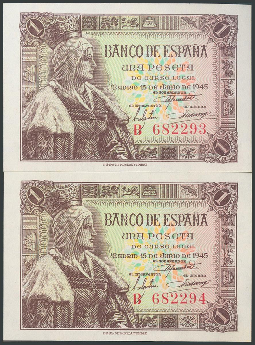 1 peseta. June 15, 1945. Correlative pair. Series B. (Edifil 2017: 448a). Original sizing. UNC.