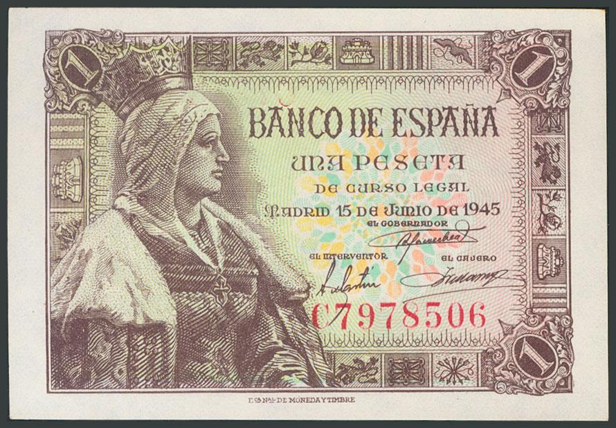 English 1 peseta. June 15, 1945. Series C. (Edifil 2017: 448a). Original sizing. UNC.