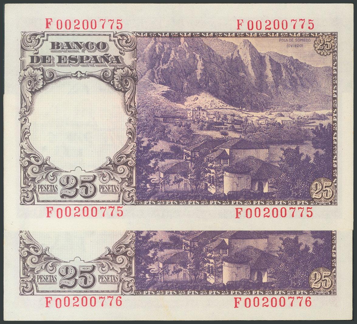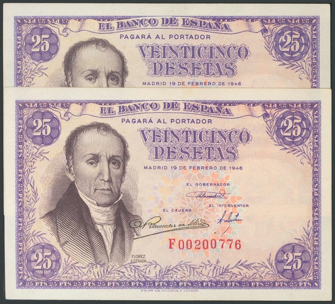 25 Pesetas. February 19, 1946. Correlative couple. Series F. (Edifil 2017: 450a). Original sizing. UNC.