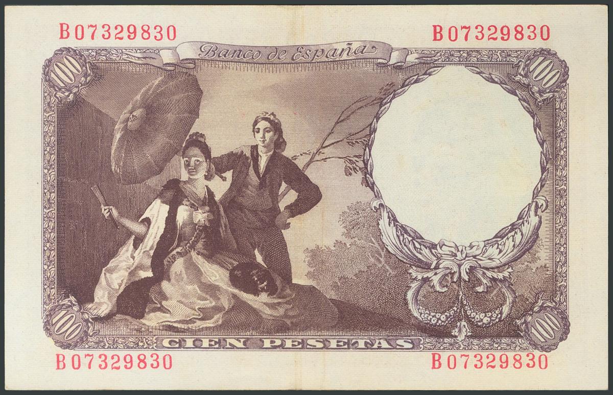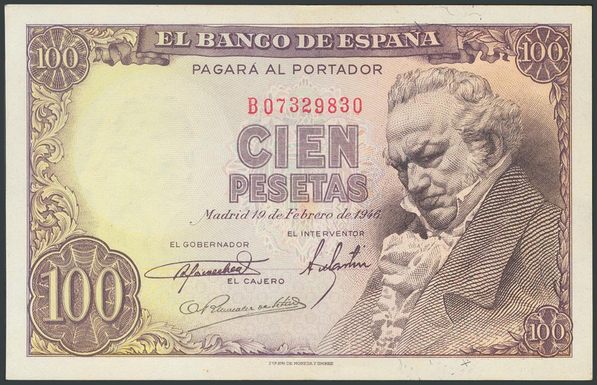 100 Pesetas. February 19, 1946. Series B. (Edifil 2017: 451b). It retains a large part of its original size. AU.